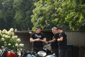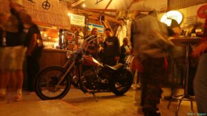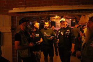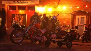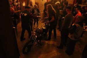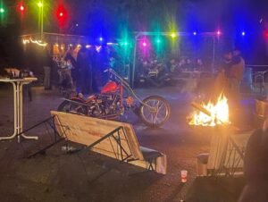 Die Location war der Hammer. Draußen gab’s eine Bar und einen Grillstand, dazu ’ne Couch zum Chillen und eine richtig coole Sitzrunde um die Feuerschale. Perfekt, um mit einem kalten Bier in der Hand Benzingespräche zu führen. Überall standen geparkte Chopper. Und dann das Clubhaus: zwei Etagen voller Szene-Feeling. Unten die Tanzfläche, wo später am Abend noch ordentlich abgetanzt wurde. Eine kleine, aber feine Bar, an der man immer jemanden zum Quatschen gefunden hat. Einfach eine richtig geile Bude sehr gemütlich, authentisch und perfekt für so ein Fest.