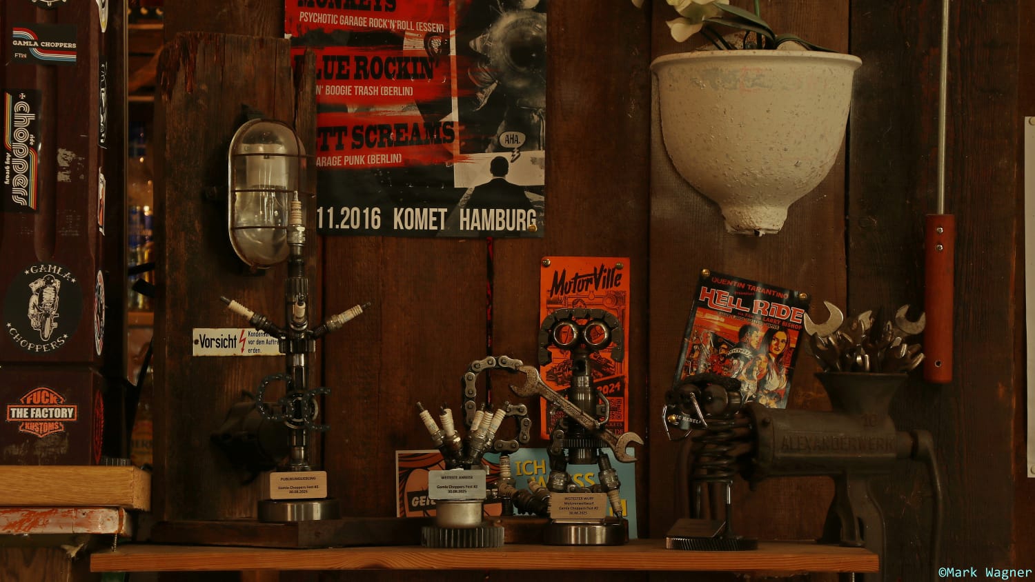 Die Location war der Hammer. Draußen gab’s eine Bar und einen Grillstand, dazu ’ne Couch zum Chillen und eine richtig coole Sitzrunde um die Feuerschale. Perfekt, um mit einem kalten Bier in der Hand Benzingespräche zu führen. Überall standen geparkte Chopper. Und dann das Clubhaus: zwei Etagen voller Szene-Feeling. Unten die Tanzfläche, wo später am Abend noch ordentlich abgetanzt wurde. Eine kleine, aber feine Bar, an der man immer jemanden zum Quatschen gefunden hat. Einfach eine richtig geile Bude sehr gemütlich, authentisch und perfekt für so ein Fest.