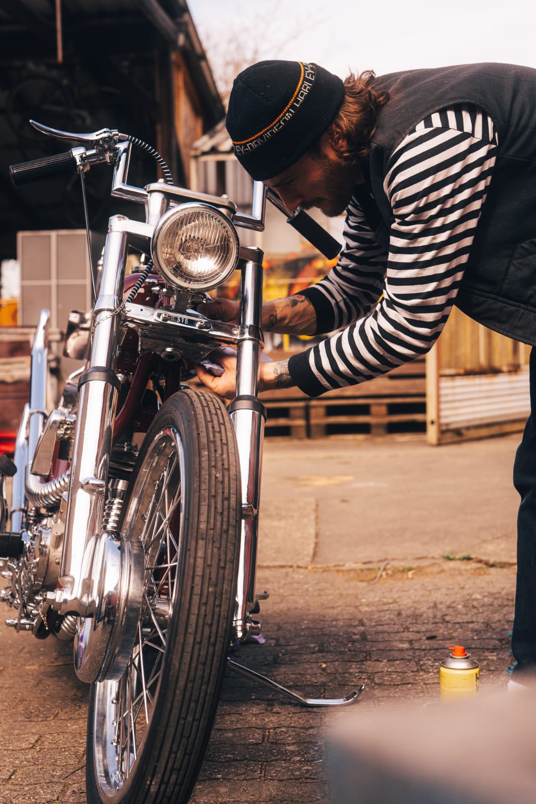 Seit seinem Einstieg in die Szene hat sich sein Stil verändert. Am Anfang war vieles noch ein Ausprobieren. Heute ist der Kurs klar: Oldtimer, starrer Rahmen, keine Blinker, mechanische Bremsen. Reduziert aufs Wesentliche. Kein Kompromiss, kein Schnickschnack. Ein Stil, der gereift ist und zeigt, dass weniger manchmal mehr ist, solange es ehrlich bleibt.